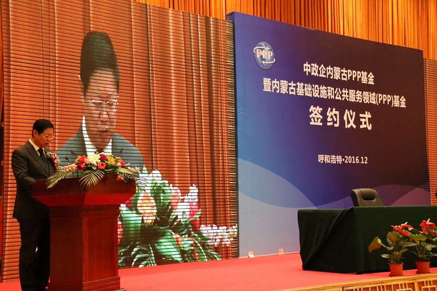 2016年12月27日,中政企內蒙古PPP基金、內蒙古基礎設施和公共服務投資引導基金兩支PPP重磅基金在呼和浩特市簽約落地。自治區(qū)副主席王波、中國政企合作投資基金股份有限公司董事長周成躍、自治區(qū)財政廳廳長張華、呼和浩特市市長李杰翔等出席簽約儀式。